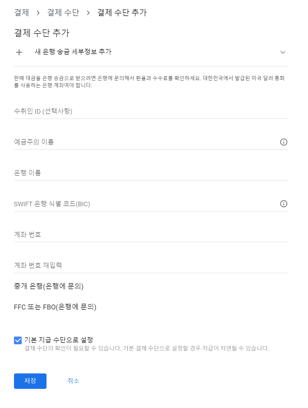 은행 이름 SWIFT 은행 식별 코드(BIC) 계좌 번호 계좌 번호 재입력 을 하고 저장하시면 끝입니다.