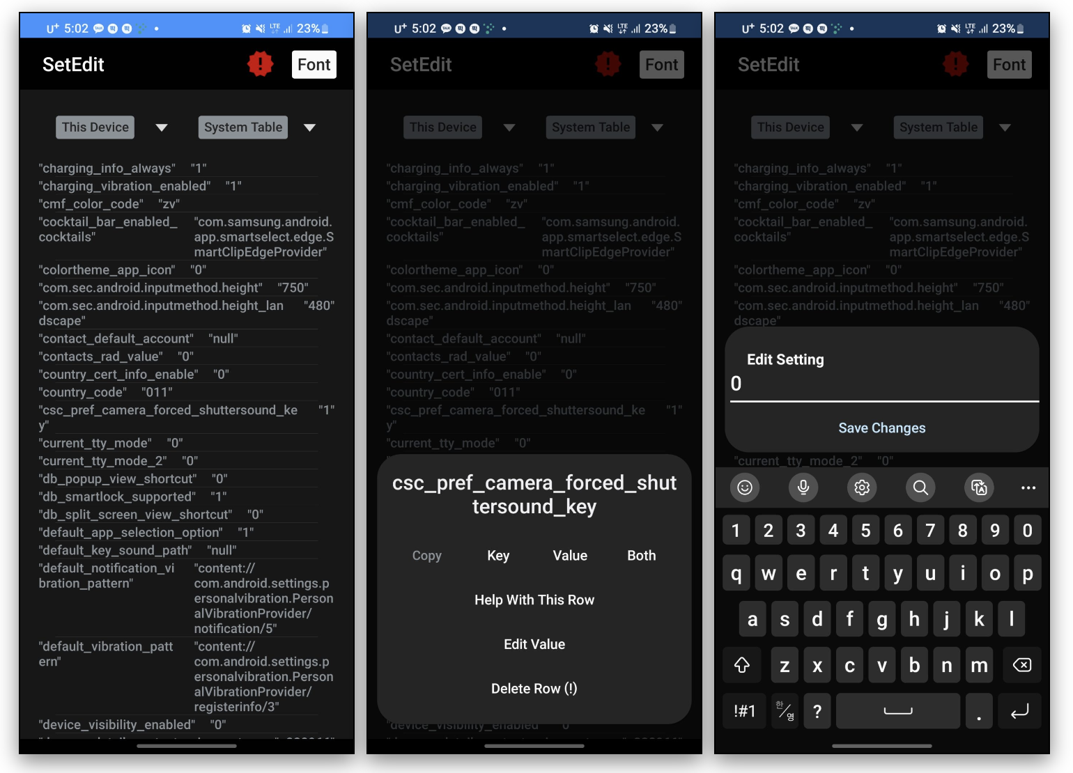 예외로 해당 값이 없을 경우는 값을 추가해주면 된다고 합니다 Add New Setting 을 눌러서 값을 추가해보세요 이제 무음모드에서는 소리가 들리지않고 벨소리 일때만 셔터음이 들리게 됩니다.