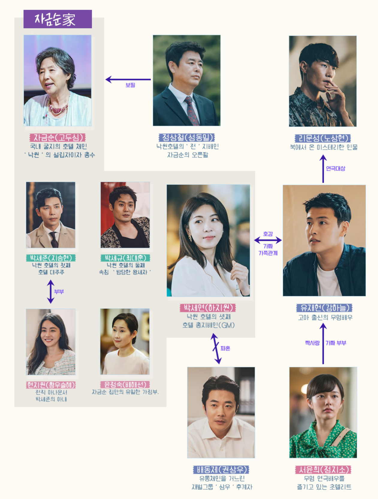 고두심(자금순 역) 호텔낙원의 총수 함경도에서 태어났다 남은시간은 3개월 죽음에 대한 두려움이 없다고 하지만 북에서 내손을 잡았던 그아이를 한번만 보고싶어한다 그 연기를 강하늘이 한다