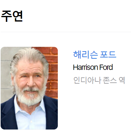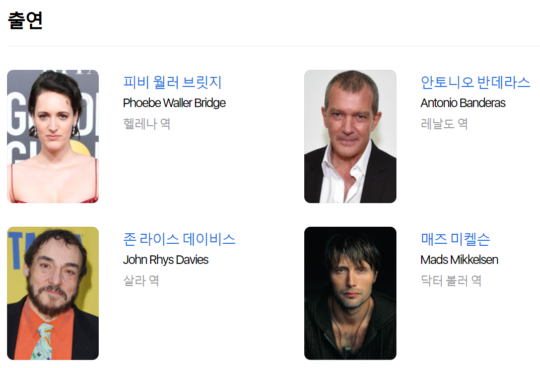- 인디아나 존스 역의 해리슨 포드를 비롯해 피비 월러-브리지, 안토니오 반데라스, 에단 이시도르, 매즈 미켈슨 등이 출연합니다.