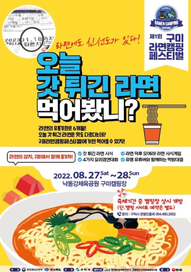 구미 라면캠핑 페스티벌? 재밌는 행사 안내 구미에서 8월27 28일 양일간 진행되는 제 1회 구미라면캠핑페스티벌 소식입니다. 낙동강체육공원 구미캠핑장에서 진행되네요 구미가 왜 라면의 성지인가? 농심공장이 위치해있죠 협찬이 농심입니다ㅋㅋㅋ 황치열 외 버스킹 공연도 함께 한다고 하니까 구경가볼수 있겠네요. 축제기간중 캠핑장은 상시 개방이라고 해요