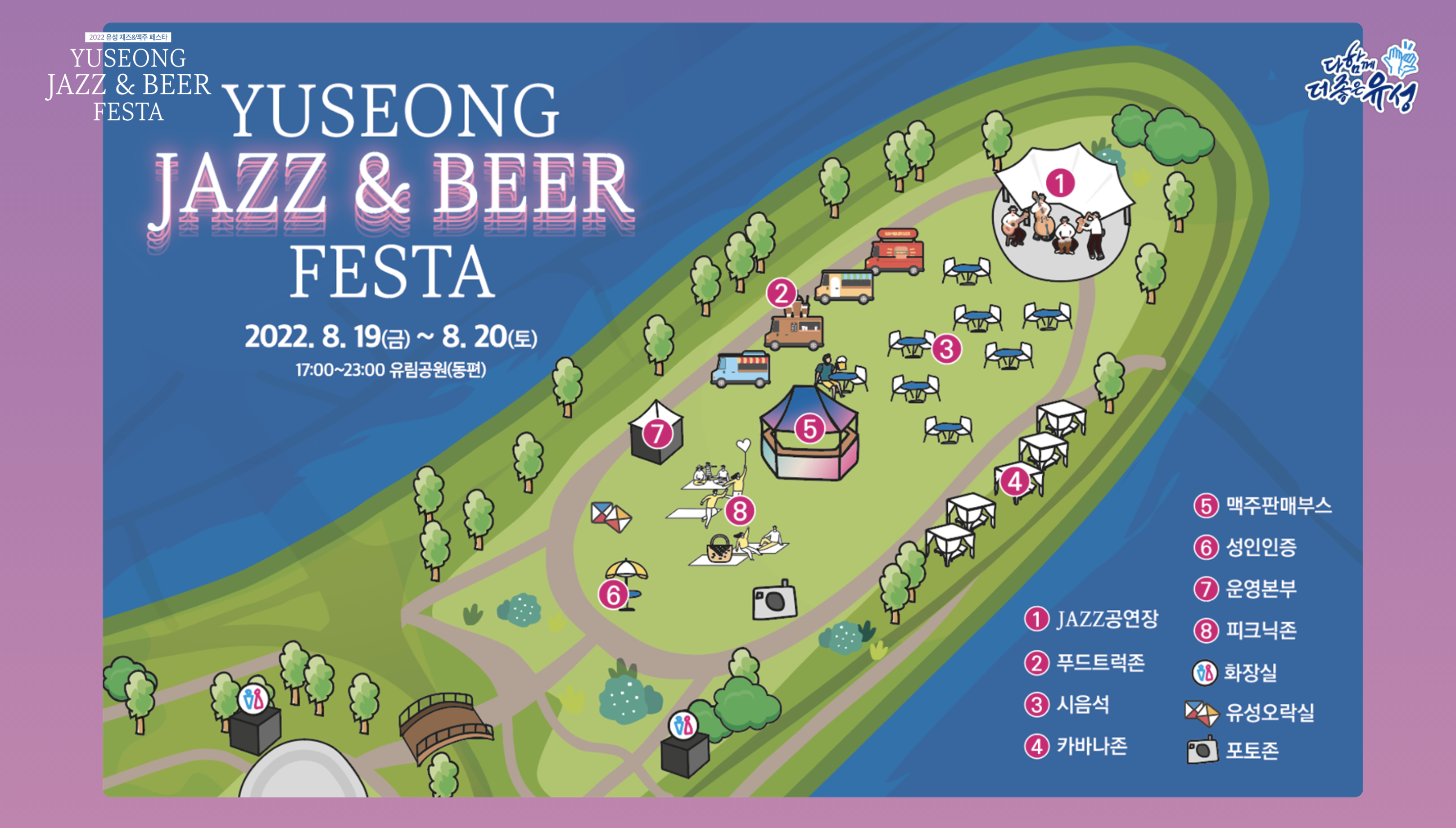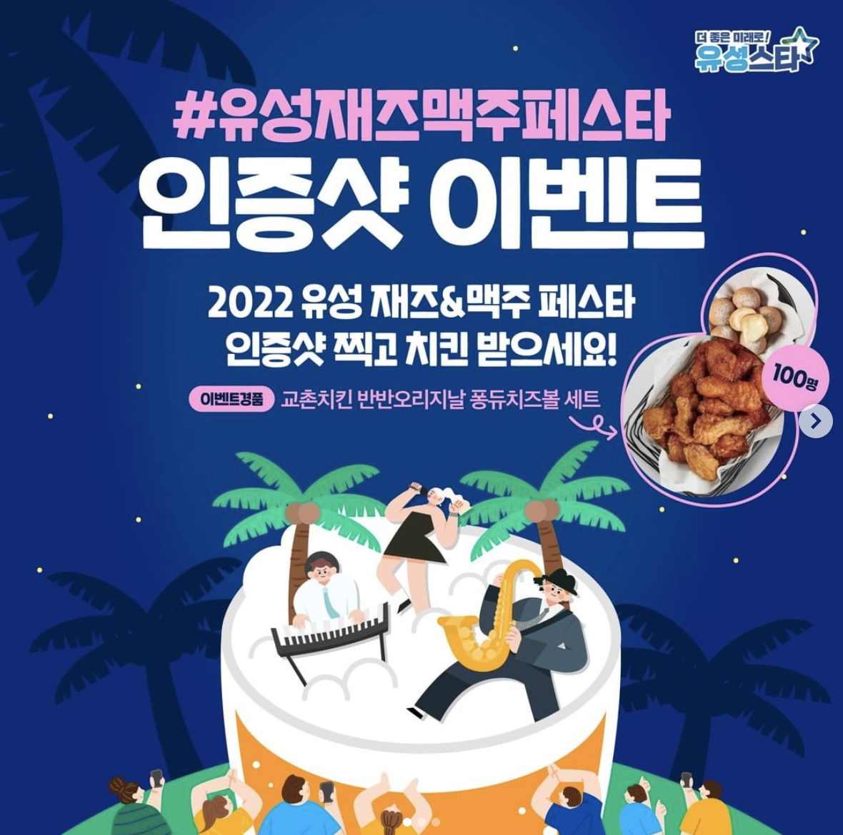 yuseonggu[유성재즈맥주페스타 인증샷 이벤트]2022 유성 재즈&맥주 페스타인증샷 찍고 치킨 받으세요🍗✅ 인증샷 이벤트 참여방법① 유성 재즈&맥주 페스타를 즐기고 있는 모습을 사진 또는 영상으로 촬영해주세요.② 개인 인스타그램에 필수 해시태그와 함께 인증샷을 업로드 해주세요.- 필수 해시태그 : #유성재즈맥주페스타 #유재페 #YJF✅ 이벤트경품교촌치킨 반반오리지널 퐁듀치즈볼 세트 교환권(1매) / 100명✅ 이벤트기간2022. 8. 19.(금) ~ 8. 22.(월)✅ 당첨자발표