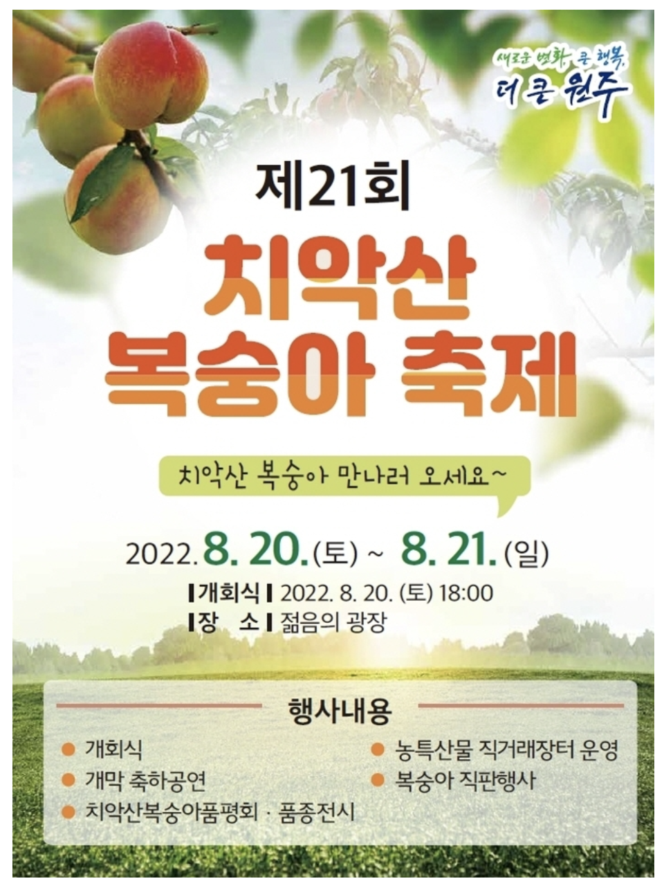 치악삭 복숭아 축제 원주20일 21일 주말 양일간 진행되네요 치악산은 복숭아가 잘자라는 조건으로 원주의 대표적인 농특산물이에요