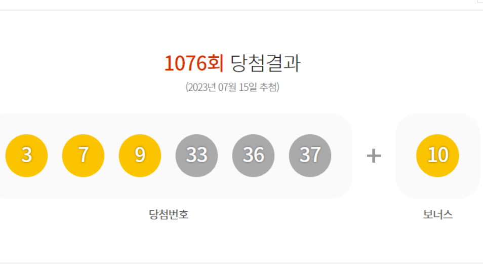 제1076회 로또 당첨번호는 3, 7, 9, 33, 36, 37이며, 보너스 번호는 10입니다. 이번 회차의 당첨번호는 지금까지 가장 많이 추첨된 번호들과 크게 다르지 않습니다.