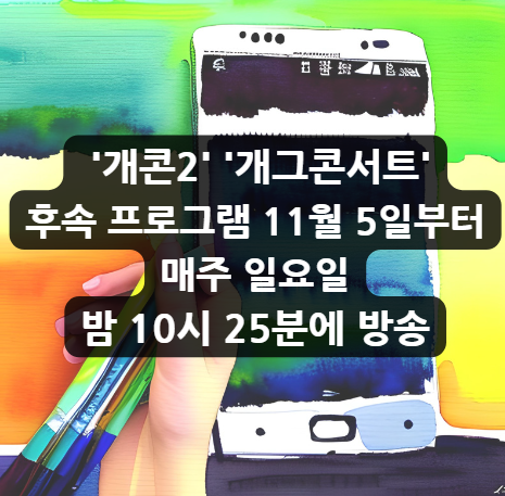 KBS의 공개 코미디 프로그램 '개콘2'는 11월 5일부터 방송될 예정입니다. '개콘2'는 '개그콘서트'의 후속 프로그램으로, 다양한 희극인들이 재미있고 신선한 코너들을 선보일 것입니다. '개콘2'에 대한 시청자들의 반응은 긍정적이거나 부정적이거나 다양합니다. 저는 '개콘2'가 전 국민의 웃음을 위해 최선을 다하고, 코미디의 명맥을 이어가기를 바랍니다. 여러분은 '개콘2'에 대해 어떻게 생각하시나요? 댓글로 의견을 남겨주세요. 감사합니다.