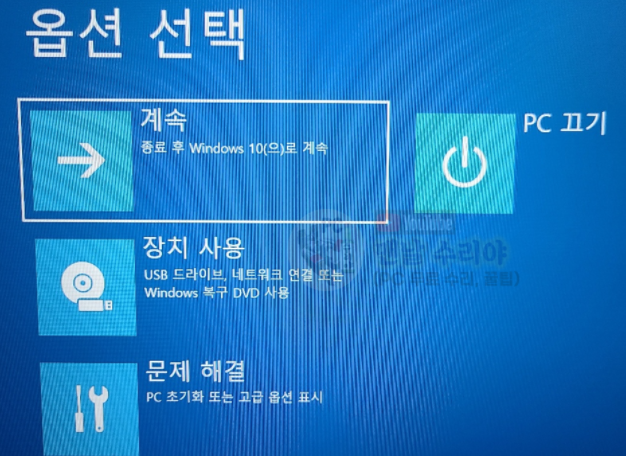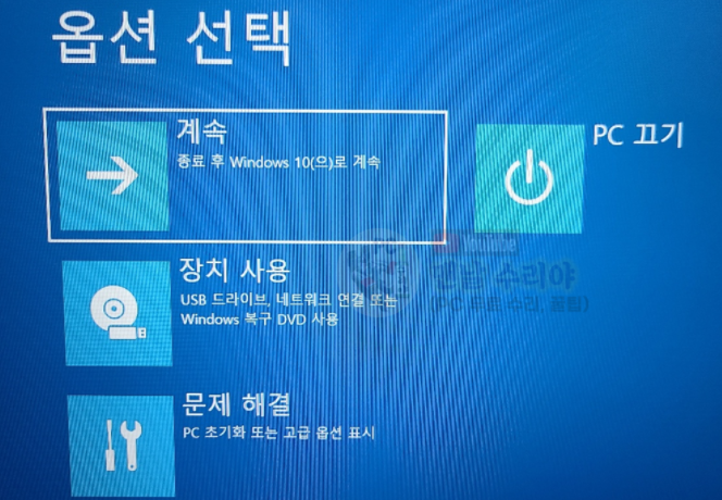 3) 혹시 위의 검은 화면이 안뜨고, 아래처럼 맨 처음봤던 파란 화면이 뜬다면 1번의 방법을 중간부터 따라하시면 된다