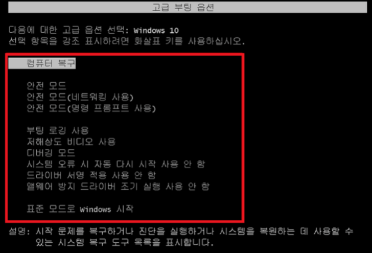 아래와 같은 화면이 뜬다면 [안전 모드]를 방향키로 선택하여 실행하면 된다.