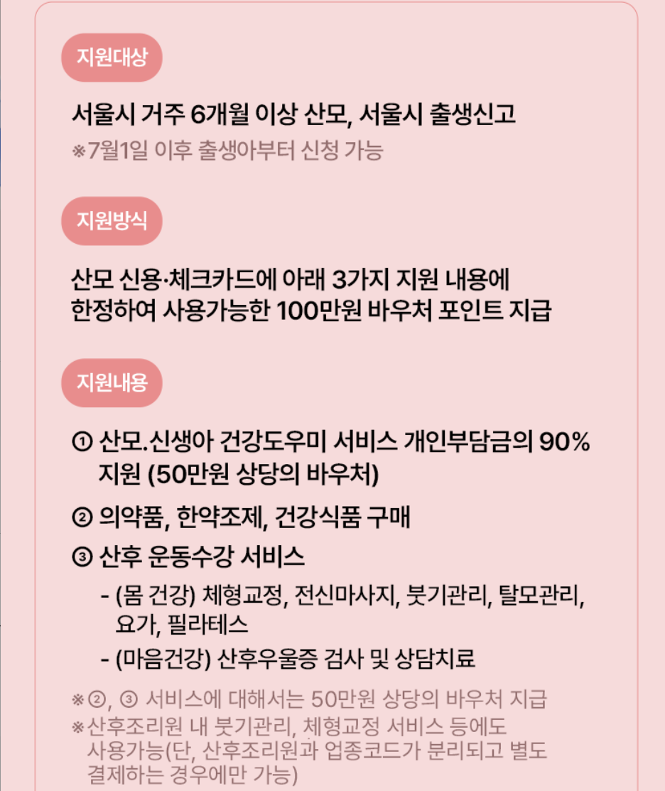 서울시는 이번 사업을 통해 출산 후 몸과 마음의 건강이 좌우되는 만큼 소득 기준 없이 모든 산모들에게 지원해 빠른 회복을 도울 계획입니다. 출산한 여성의 평생 건강을 위해 많은 관심과 참여 부탁드립니다. 감사합니다.