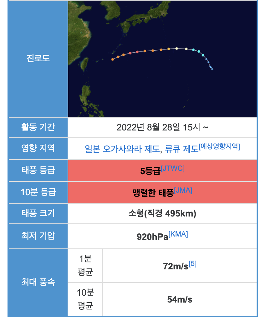 현재상태는 이렇게 강력한 5급 태풍으로 분류되고 있고 갑자기 북쪽으로 방향을 틀어 우리나라를 통과할 것으로 예상됩니다. 태풍은 9월6일 서귀포 남쪽에 들어올것으로 보입니다.
